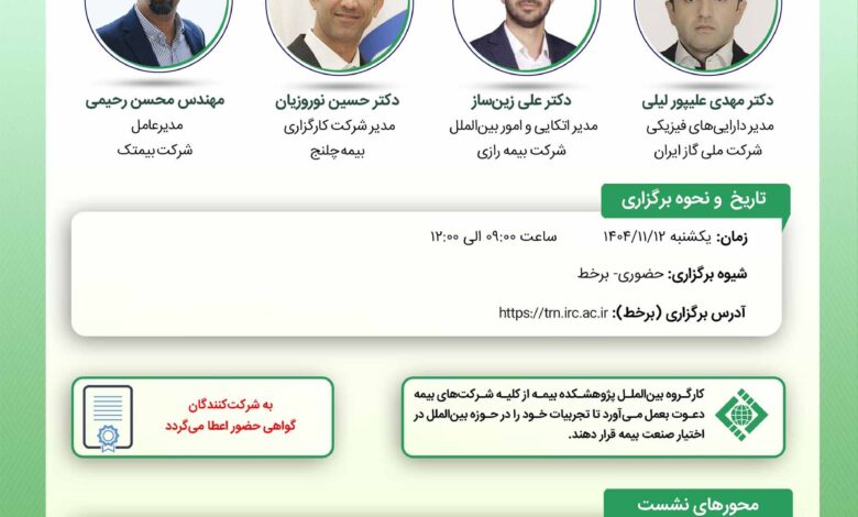 کارگاه تخصصی «چارچوبهای بینالمللی ارزیابی ریسک نیروگاههای برق» با همکاری کارگروه بینالملل پژوهشکده بیمه و شرکت کارگزاری بیمه چلنج، روز یکشنبه 12 بهمن 1404 بهصورت حضوری و برخط برگزار میشود.