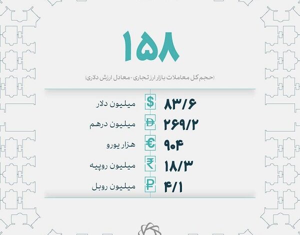 در جریان معاملات روز دوشنبه ۲۰ بهمنماه ۱۴۰۴، ارزش دادوستدهای بازار ارز تجاری مرکز مبادله ایران معادل ۱۵۸.۳ میلیون دلار شد.