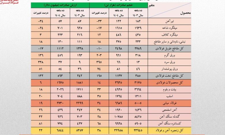انجمن تولیدکنندگان فولاد ایران آمار صادرات ۱۰ ماهه سال ۱۴۰۴ زنجیره فولاد کشور را منتشر کرد که بر این اساس حجم صادرات آهن و فولاد کشور، ۲۷ درصد و مجموع حجم صادرات کل زنجیره فولاد ۳۸ درصد افزایش داشته است.