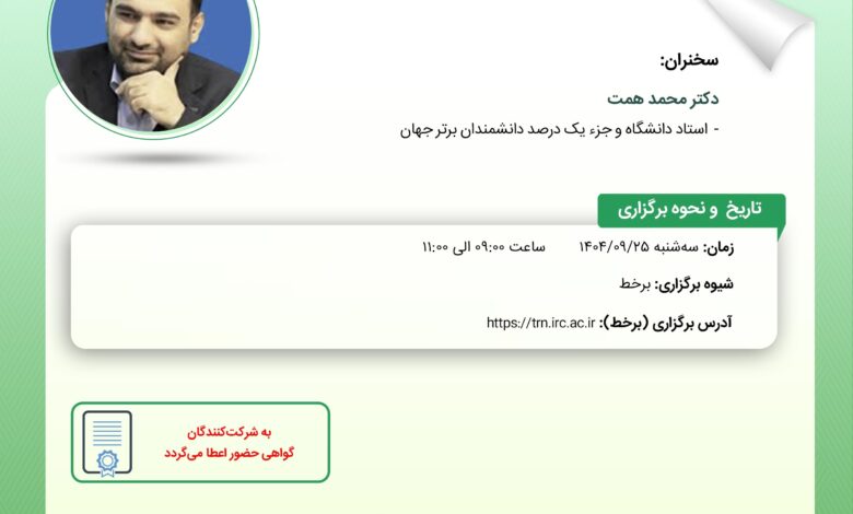 این کارگاه توسط محمد همت، استاد دانشگاه و از یک درصد دانشمندان برتر جهان ارائه خواهد شد و فرصتی ارزشمند برای ارتقای دانش و مهارتهای کاربردی در حوزه هوش مصنوعی به شمار میرود.