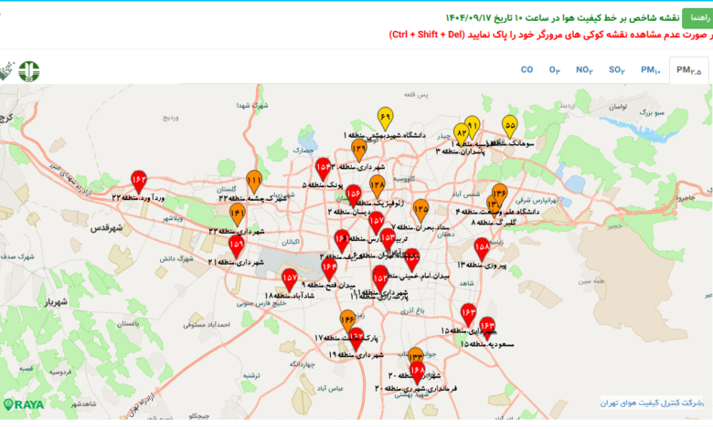هوای تهران در ۱۷ ایستگاه هواشناسی در وضع قرمز